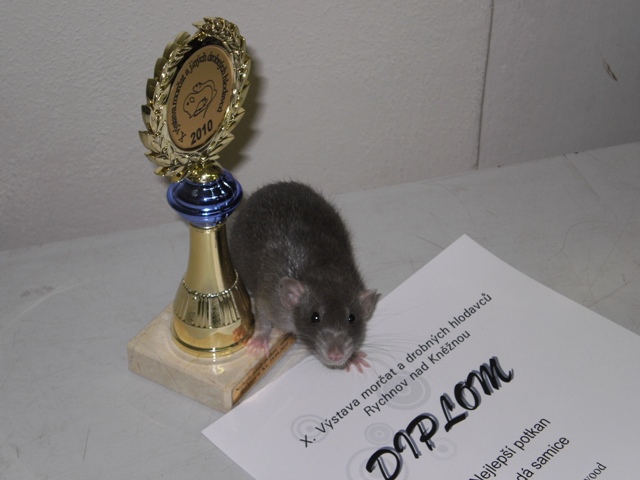 26.09.2010 14:56Včera zatraceně brzo ráno jsme vyrazily na výstavu potkanů v Rychnově nad Kněžnou. Nejdřív jsem se bála, že Ashanti bude příliš streslá, aby mohla vyhrát, že si skrčí ty svoje dumbo ouška a ušpiní se porfyrínem, přecijen, je to vůbec poprvé, co byla za život sama. Holka mě ale víc než příjemně překvapila. Za celou cestu tam nepustila jediný měkký bobek a nenechala se vyvést z klidu. Zvědavá byla a tím to haslo. Není to žádný strašpytel.